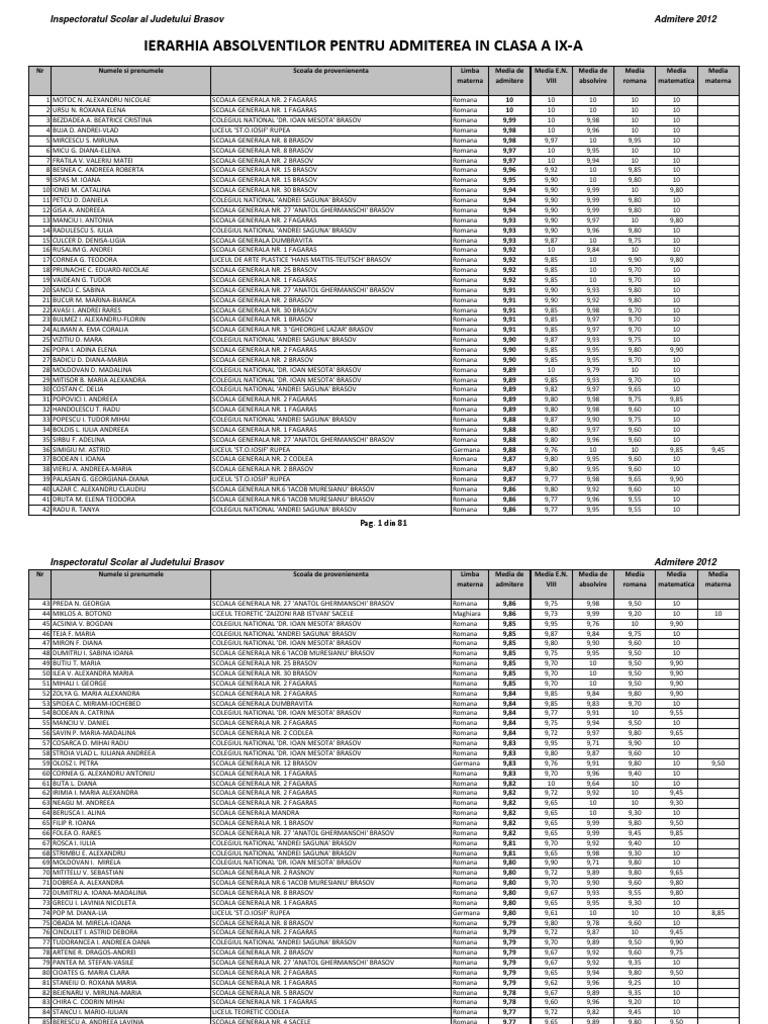 Ierarhia Absolventilor Pentru Admiterea In Media Moldovan A Ana Colegiul National Andrei Saguna Brasov 9 88 9 90 9 87 9 80 10 90 Indoitu G Victor Scoala Gimnaziala Nr 5 Brasov