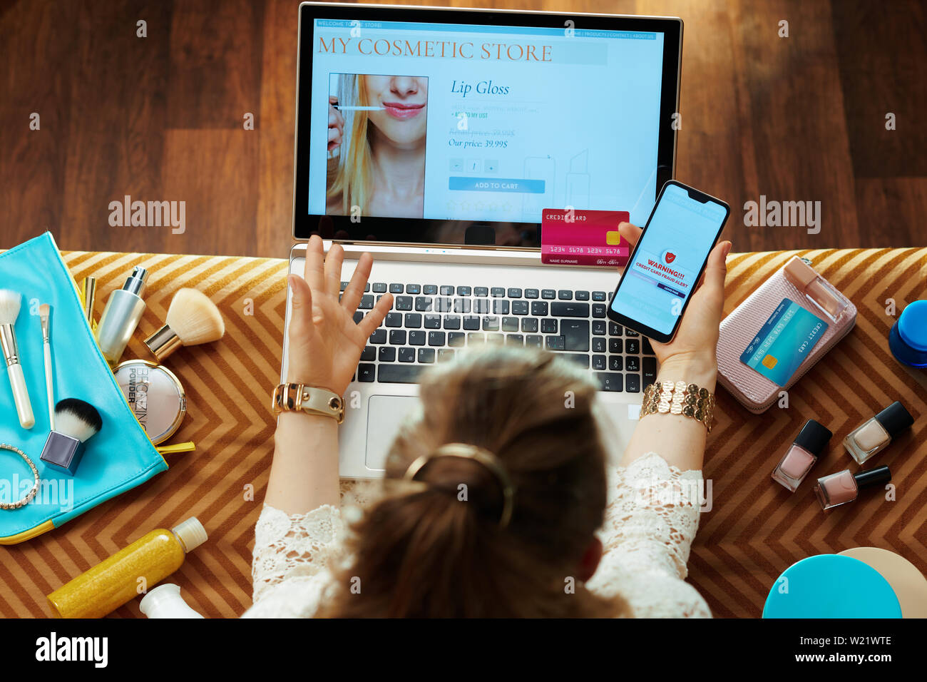 Upper View Of Trendy Housewife In White Dress With Credit Card Buying Makeup While Shop Online On A Laptop And Suffering From Online Shopping Fraud Wh Stock Photo Alamy