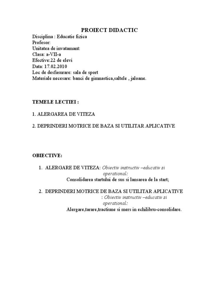 Proiect Didactic Ed Fizica Si Sport Clasa A Vii A